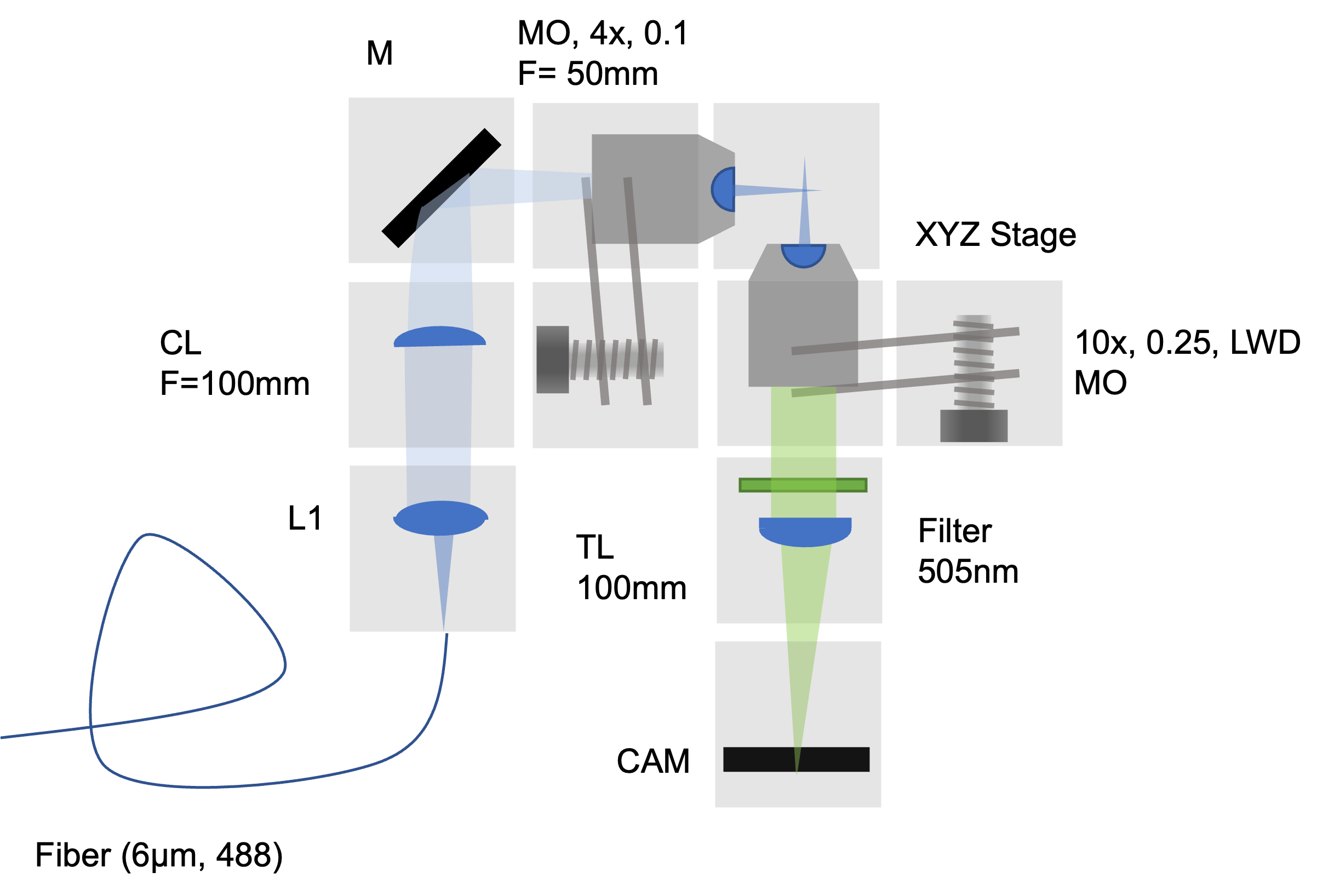 The fiber-coupled laser emits light at a wavelength of 488 nanometers, which is ideal for exciting fluorescent molecules commonly used in biological imaging, such as green fluorescent protein (GFP). The collimated laser beam passes through a cylindrical lens, creating a one-dimensional focus with a width of approximately 10 mm.