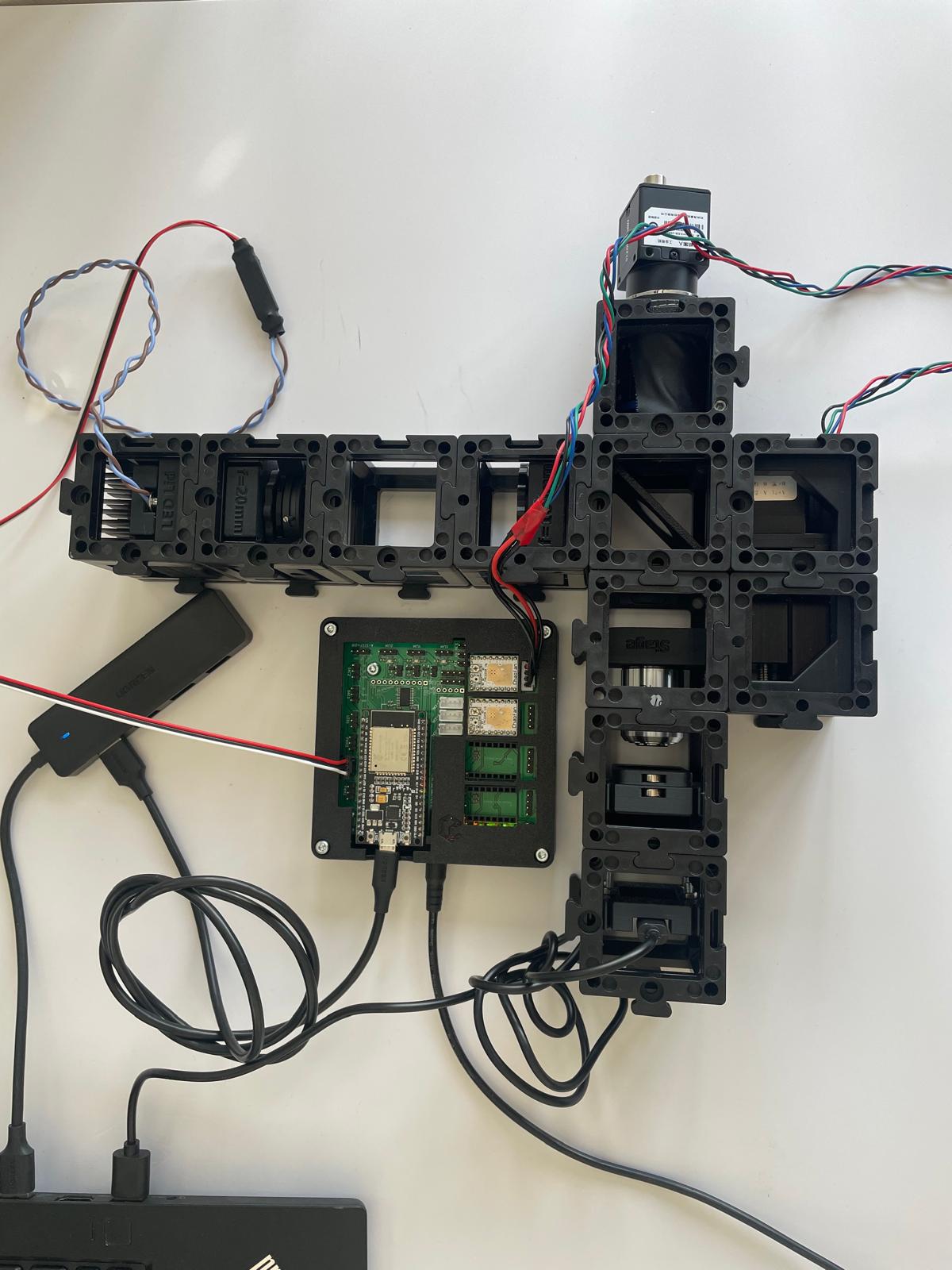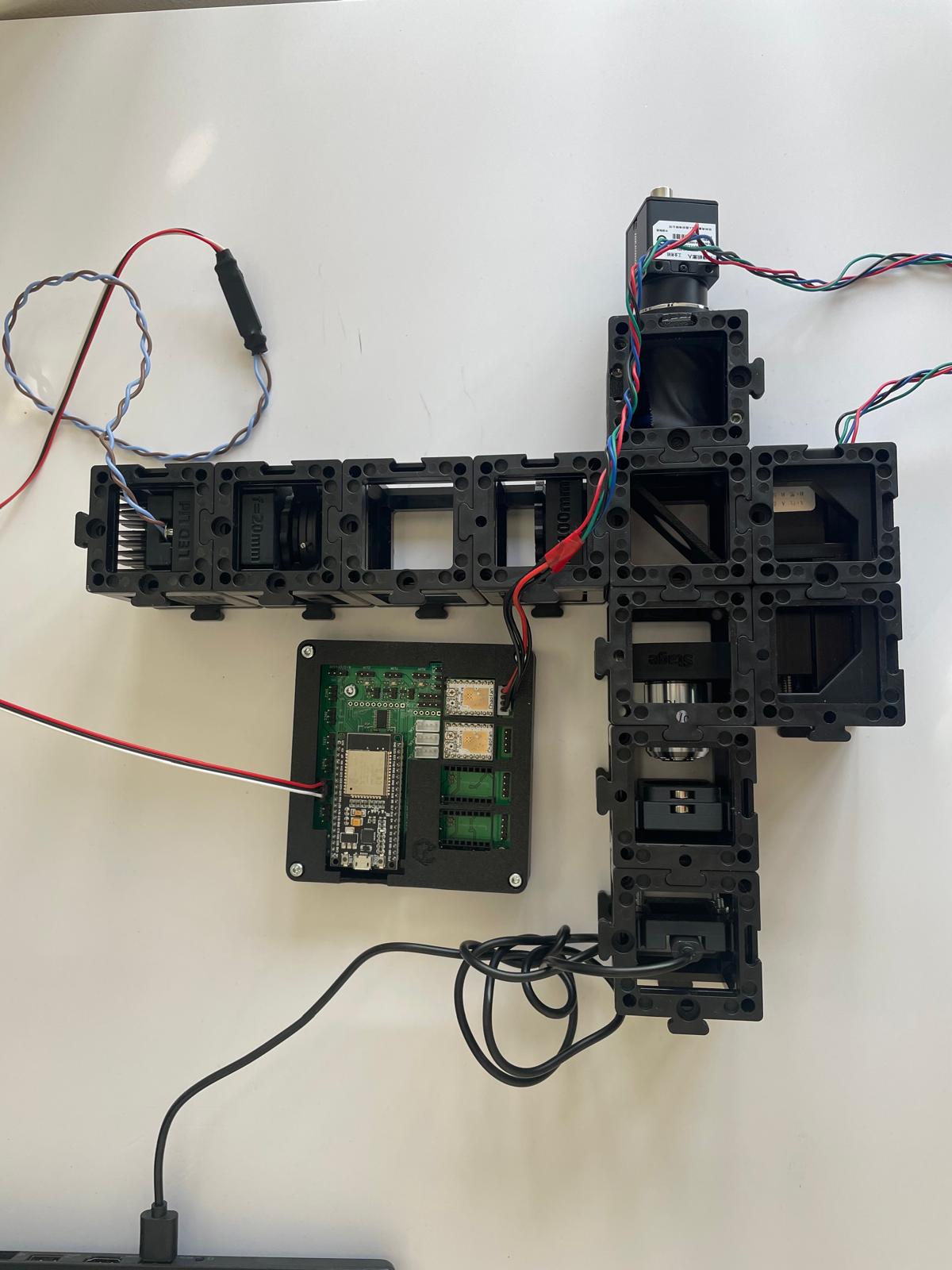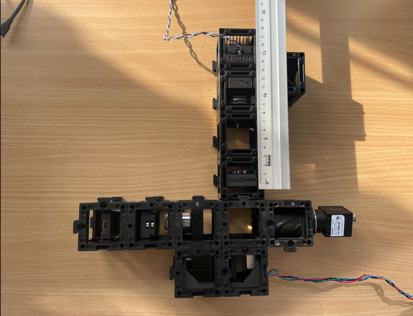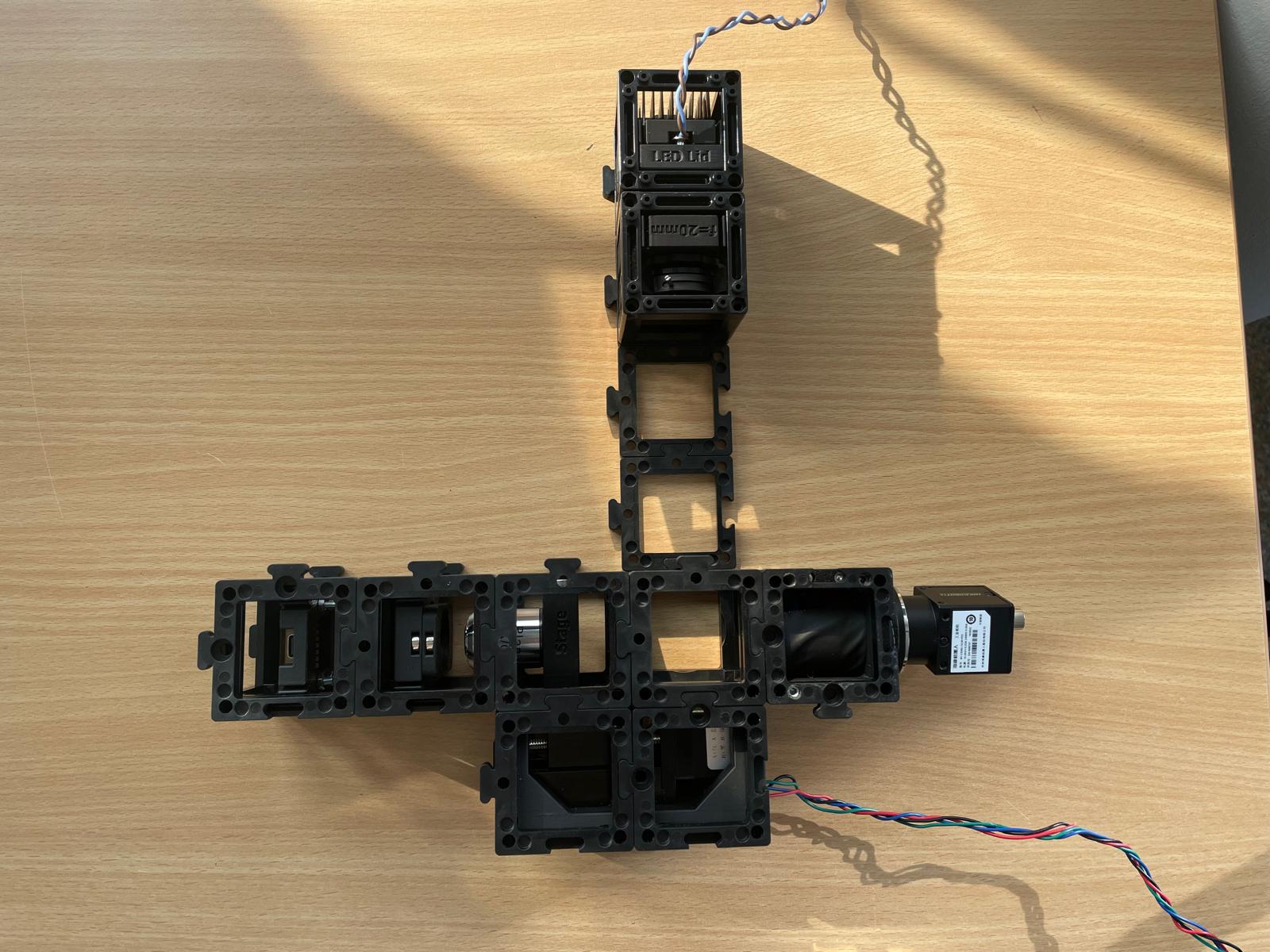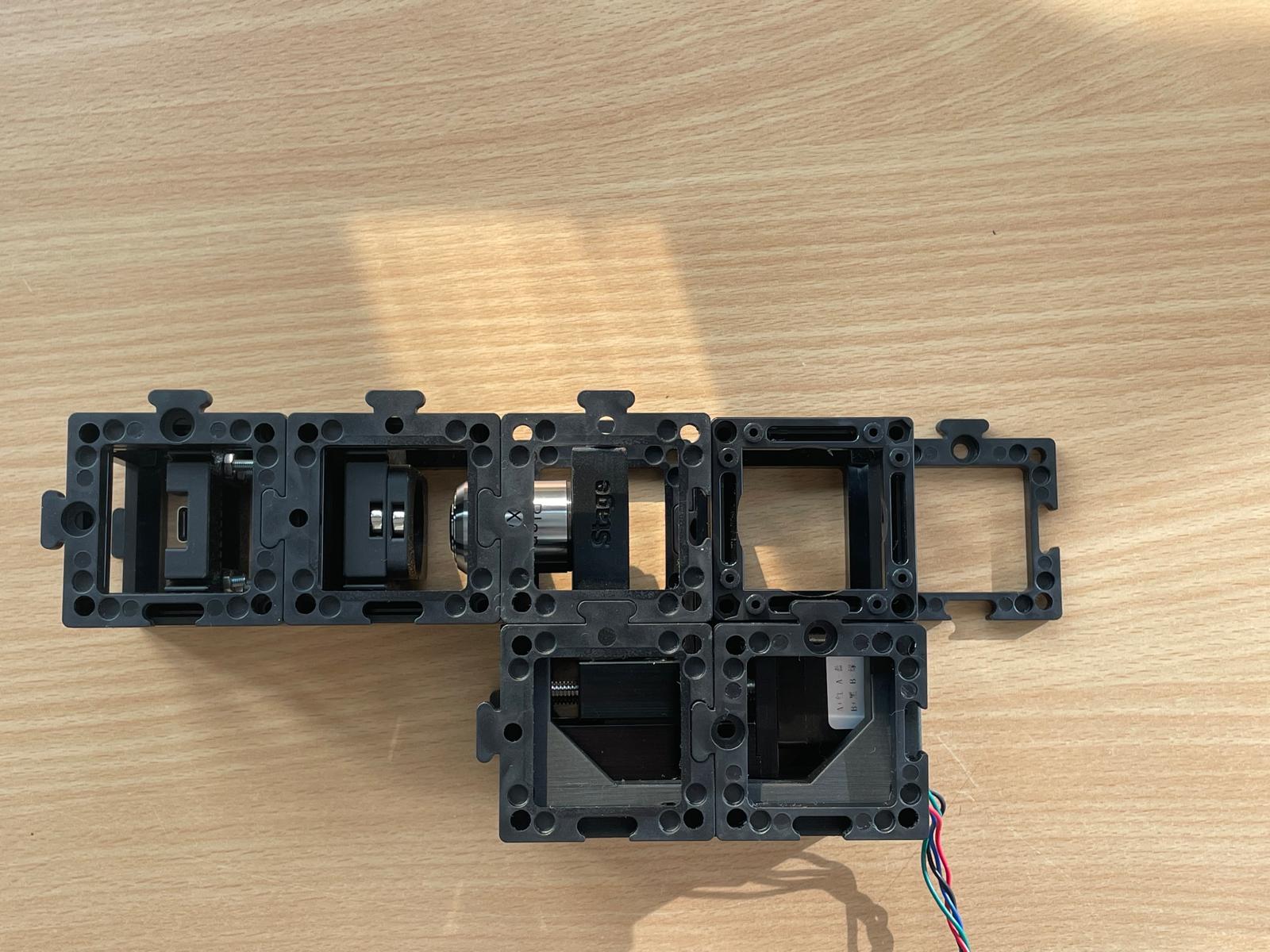 - Add the camera: Finally, attach the camera unit behind the beamsplitter and secure everything with a second layer of baseplates.