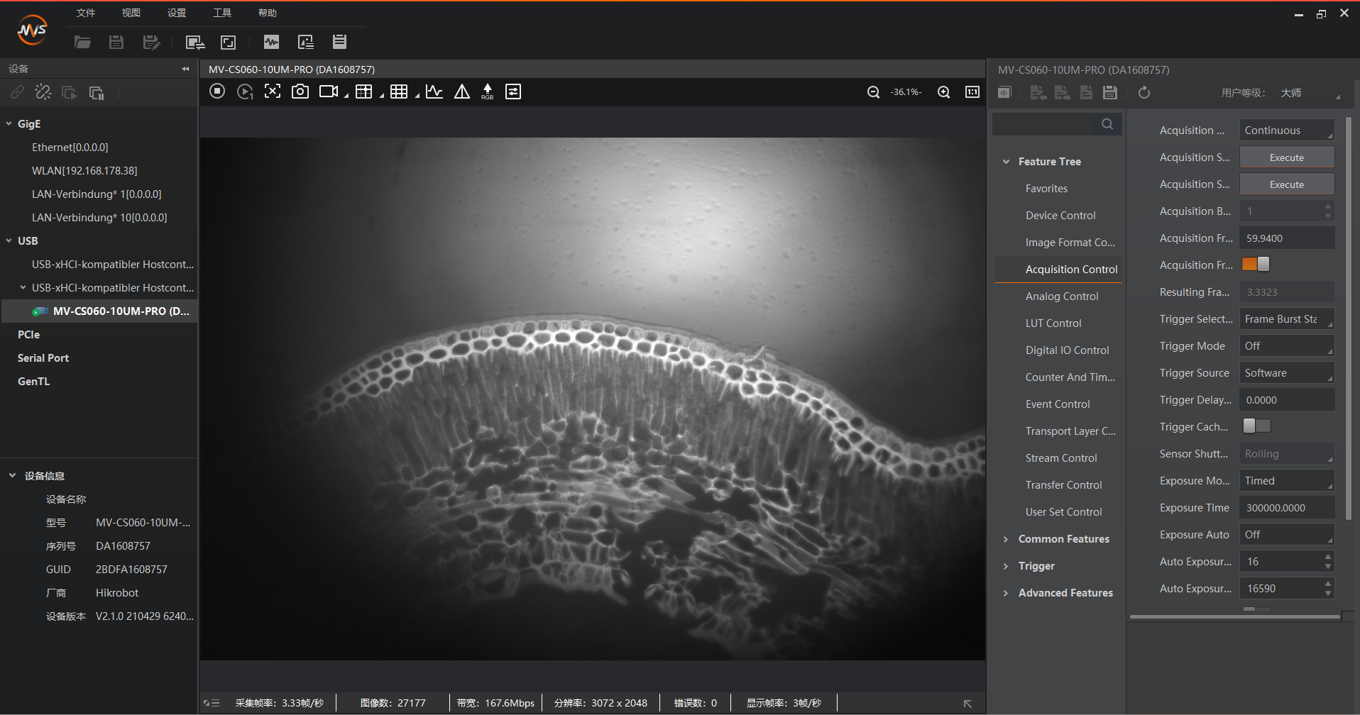 Acquisition Control, and increase theexposure timeto 300000ms. You should now see the fluorescence image. Optional you can go toAnalog Control, and increase theGain.