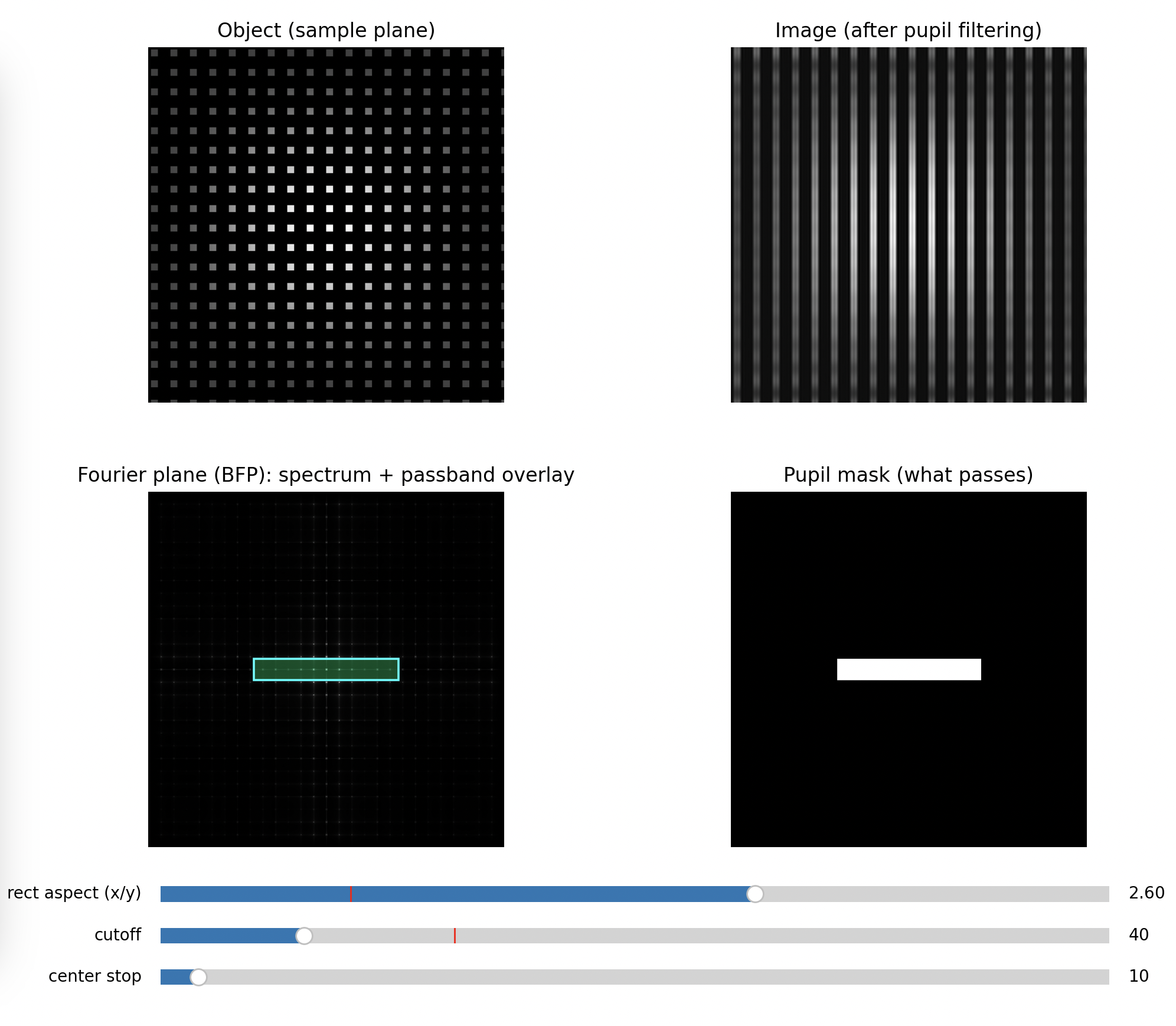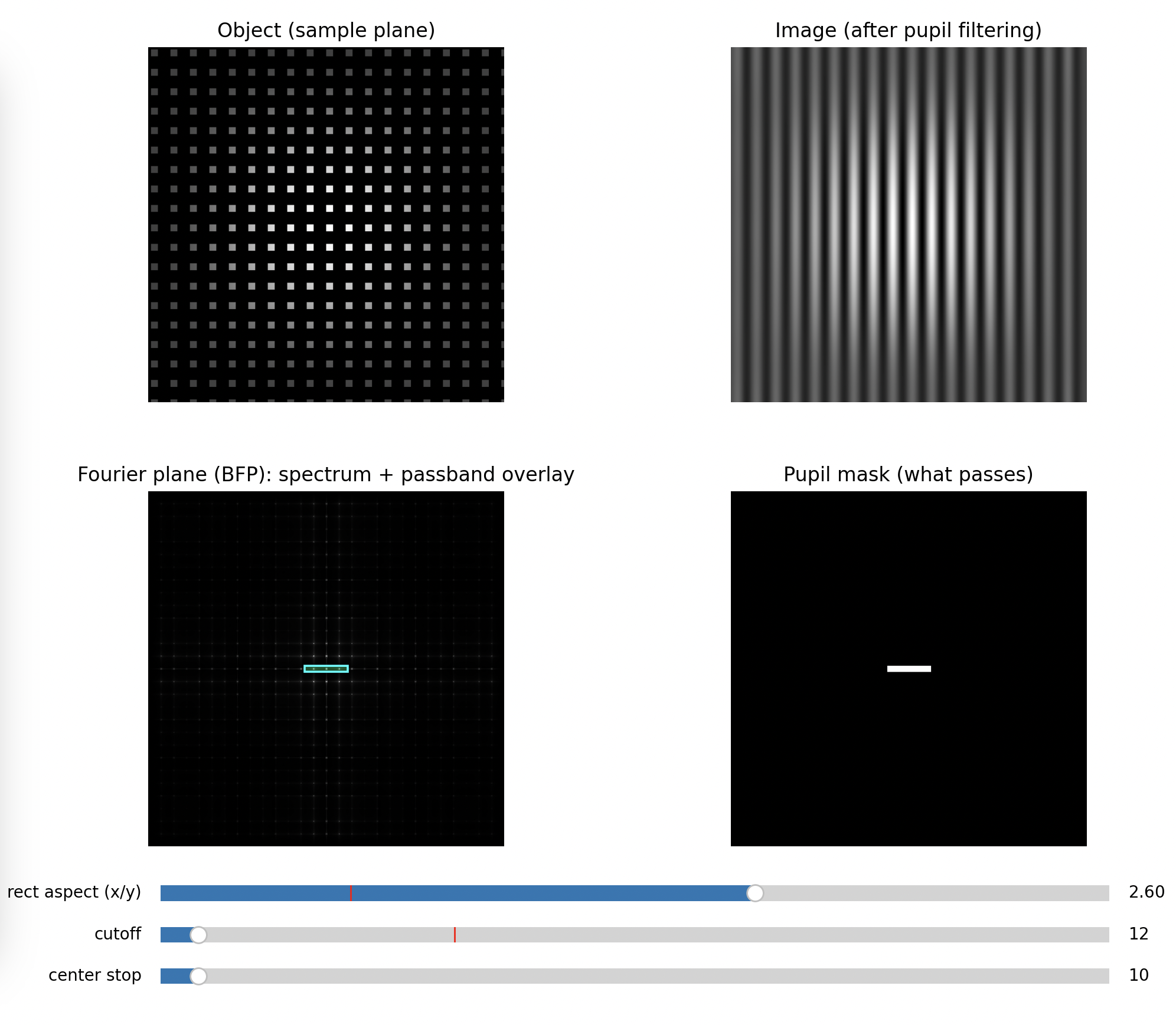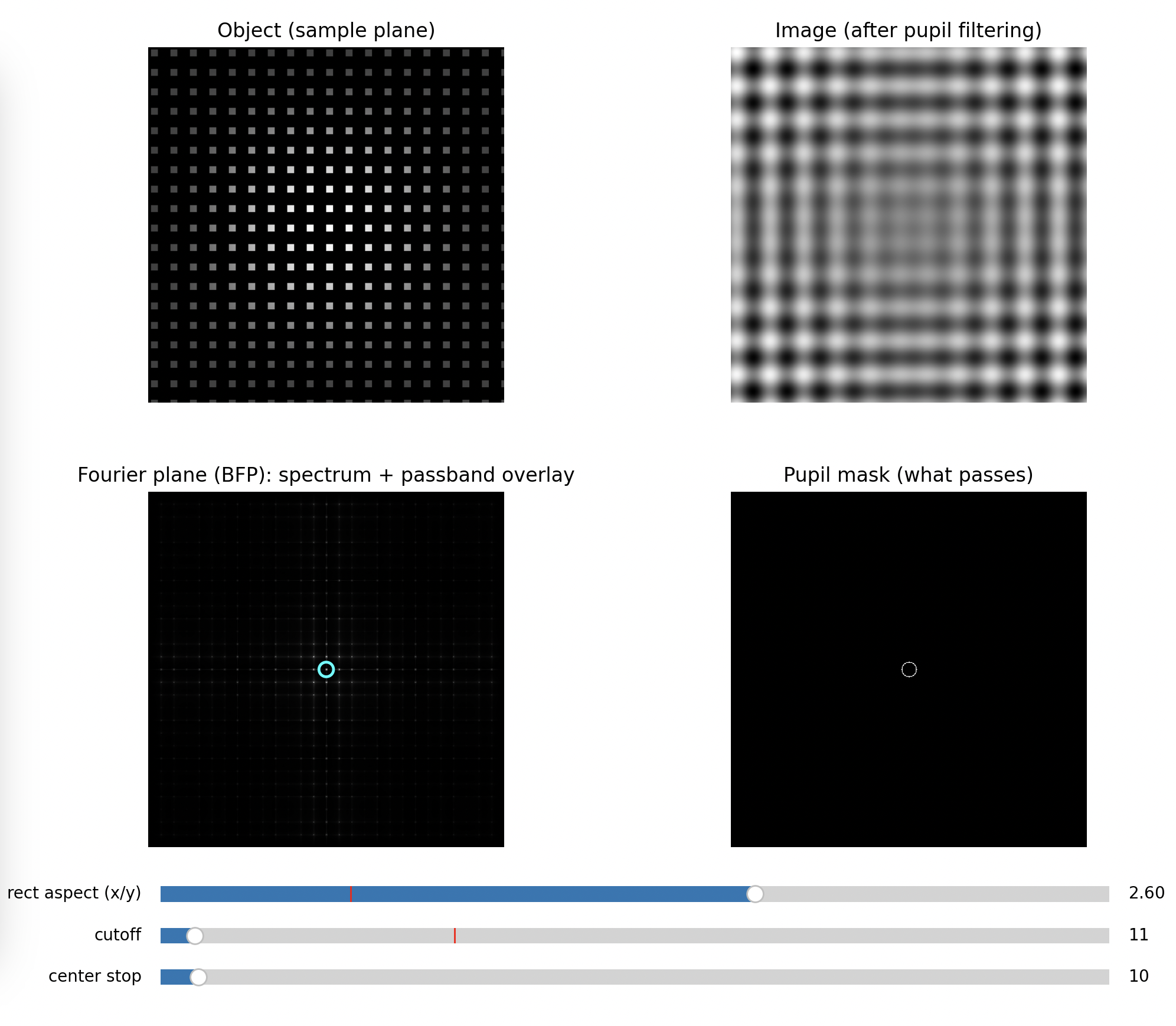 So the BFP literally displays the object’s spatial frequency content as spots or peaks. Your BFP aperture is a physical low-pass (or directional) filter in spatial frequency space.