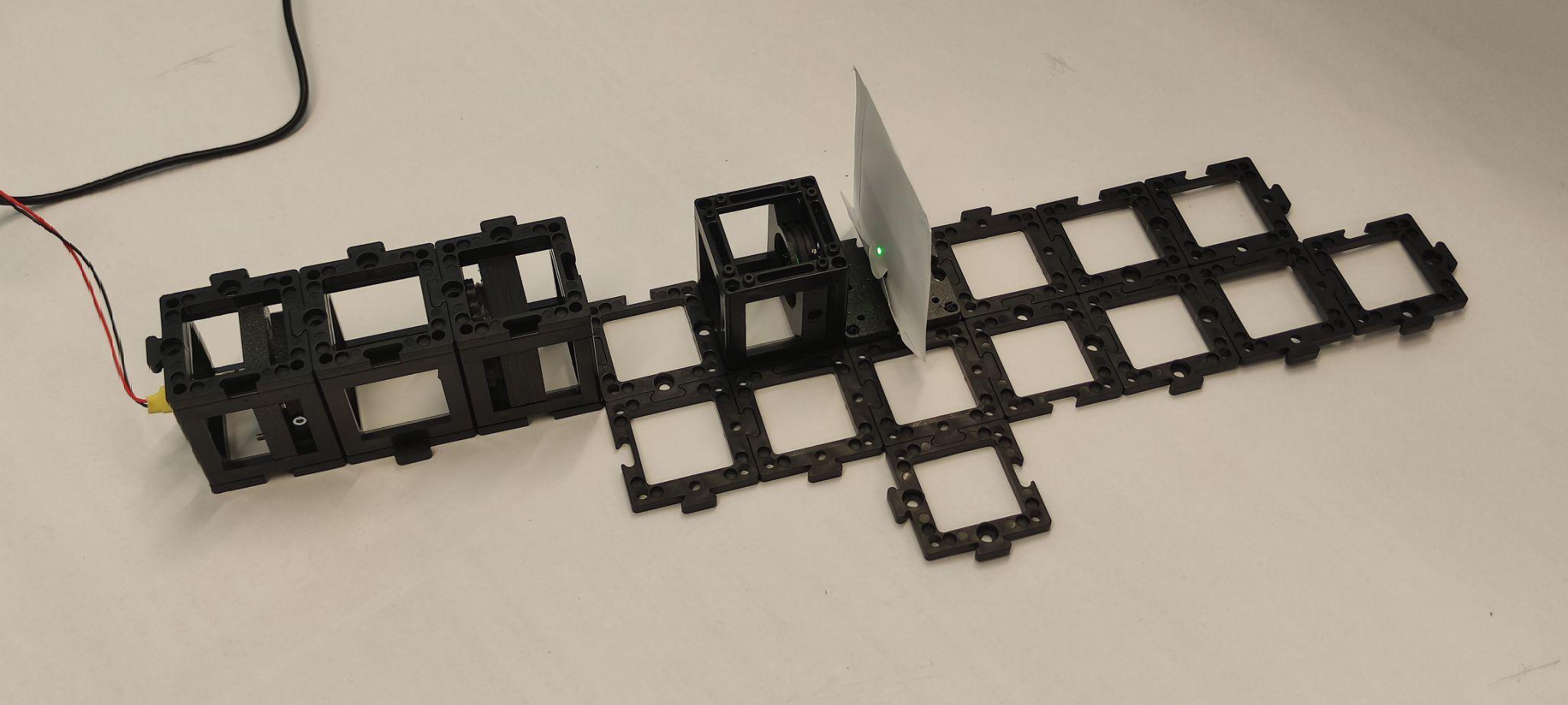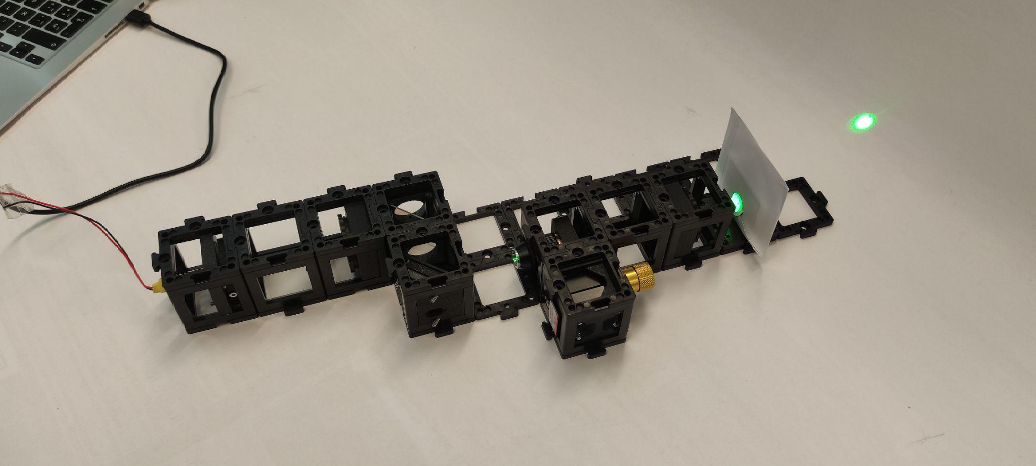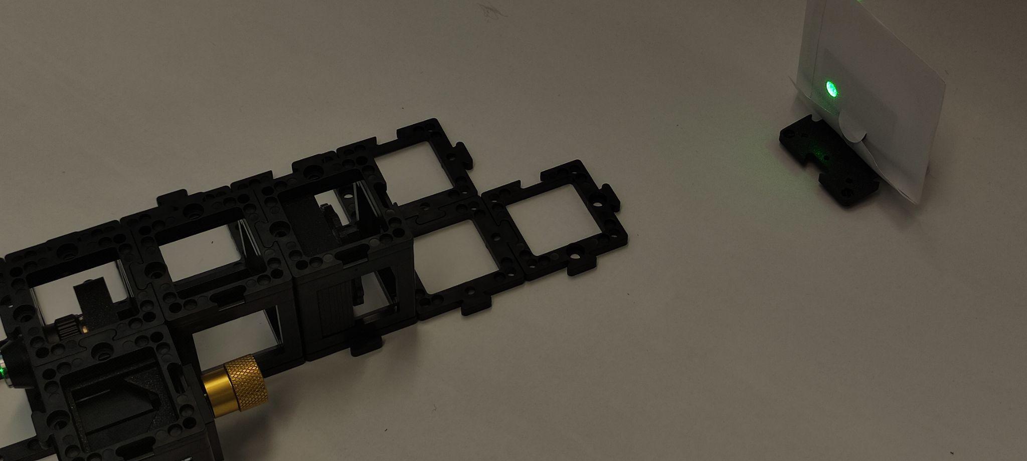 Place the beam splitter and the kinematic mirror as shown. Place the pinhole two cube units away from the mirror and the screen behind it. Turn the laser on and align the kinematic mirror using the screws. Once it's done, turn the laser off.