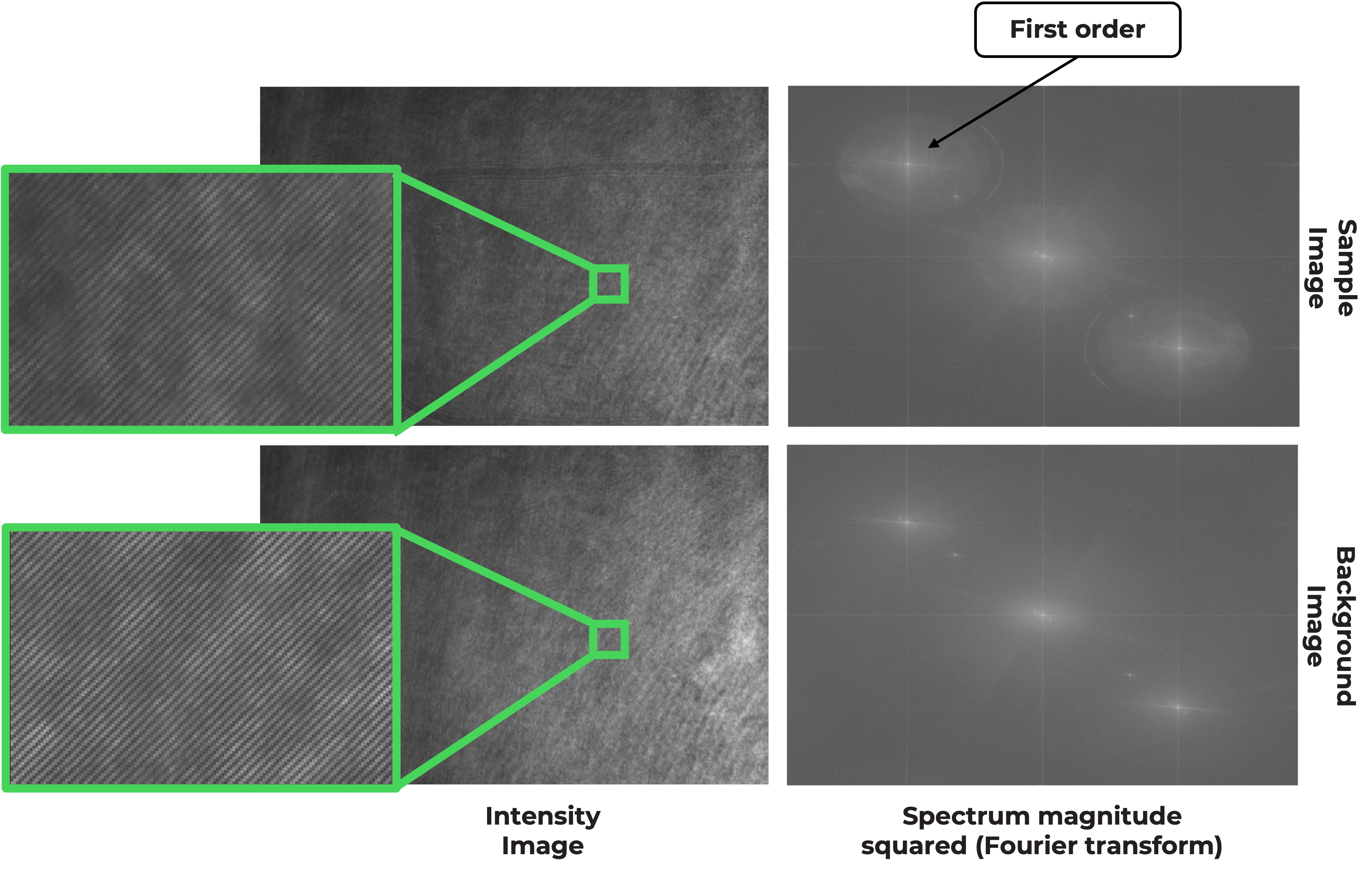 The final goal is to move the position of the first order interference to use Lei's algorithm (or some Phase unwrapping algorithm) to retrieve the phase. To achieve this, two images need to be acquired: a sample image and a background image (without a cover slide or a slide region with no specimen).