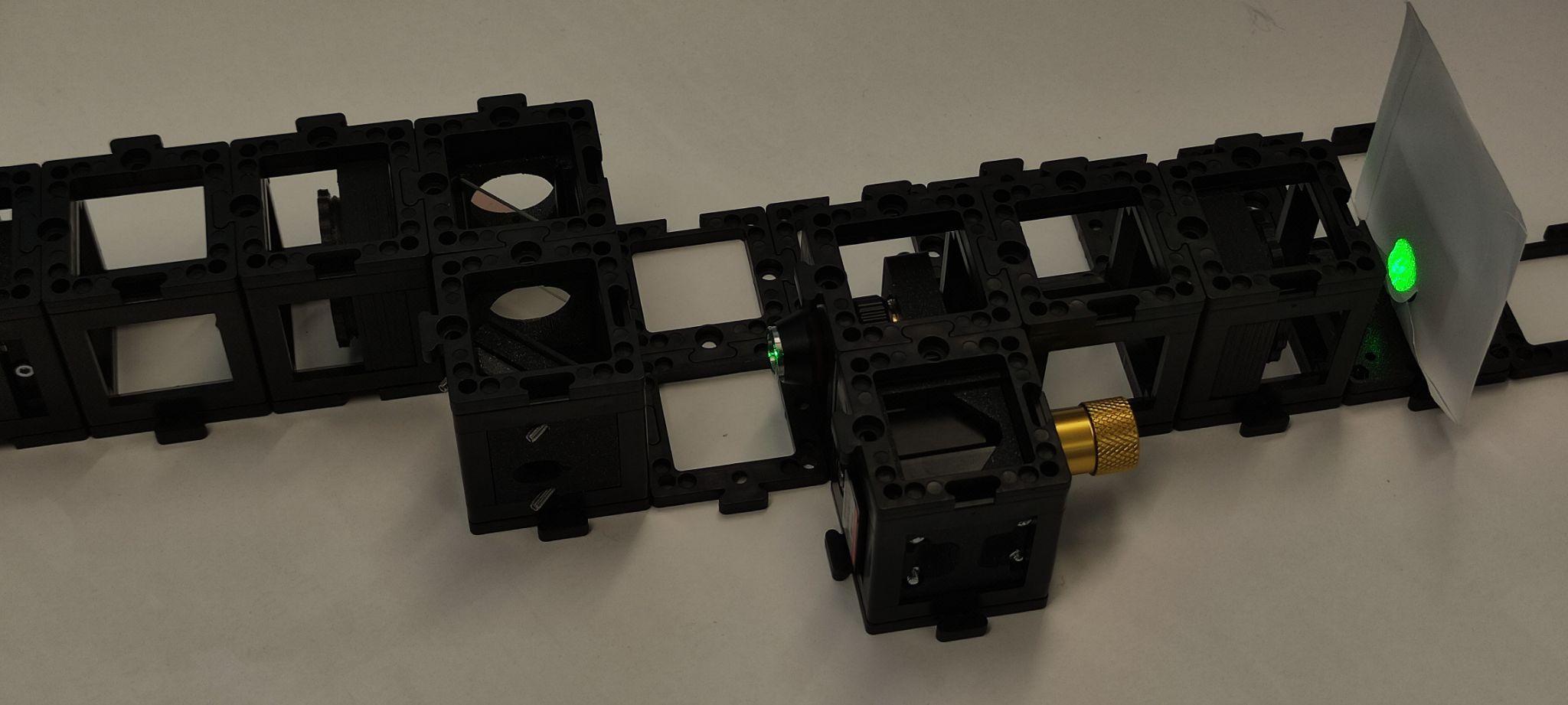 Place the laser diode, an empty cube, and a 100 mm convergent lens in a straight line. Then, place the pinhole two cube units from the lens and place the screen after the pinhole. Turn the laser on and align it by using the screws to center the beam with the pinhole.